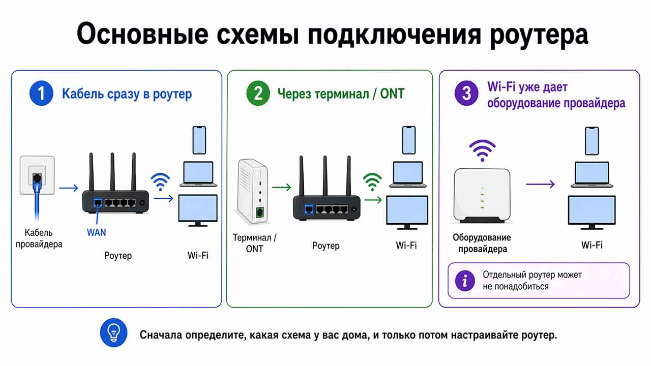 Если у вас конкретная модель, например TP-Link, тогда после общей схемы подключения уже имеет смысл отдельно уточнить, как подключить и настроить роутер TP-Link: пошаговая инструкция, потому что названия пунктов меню и логика мастера настройки у разных брендов могут отличаться.
