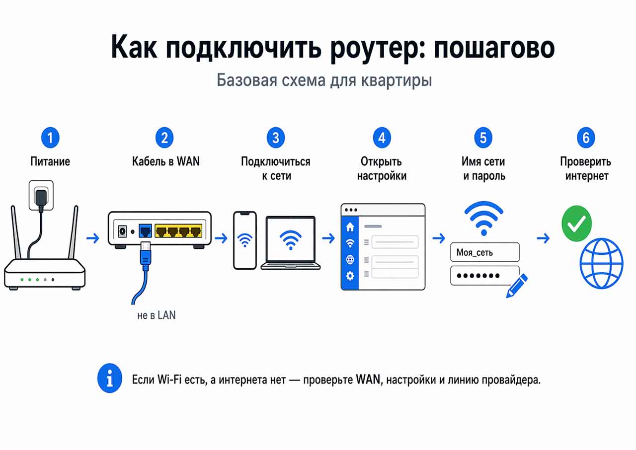 Подключить роутер в квартире обычно несложно, если сразу разделить две задачи: отдельно услугу интернета и отдельно домашнее устройство для Wi-Fi. В большинстве случаев все решается правильным подключением кабеля в WAN, быстрым мастером настройки и проверкой базовых параметров. Если же Wi-Fi появился, а интернета нет, первым делом проверяют порт, перезагрузку, линию по кабелю и тип подключения у провайдера, а уже потом делают вывод, что проблема именно в роутере.